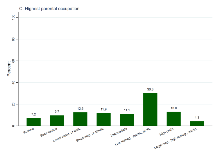 Almost nine in ten people (88.3%) gave an occupation for at least one of their parents (panel C) and three in ten of them (30.3%) indicated that lower managerial, administrative, or professional was the highest occupational status held by either of their parents. This was by far the most popular category, after which very similar numbers (between one in eight and one in nine) indicated that the highest occupational status of either of their parents was higher professional (13.0%), lower supervisory or technical (12.6%), small employer or self-employed (11.9%), or intermediate (11.1%). Finally, smaller numbers (one in ten or fewer) indicated that the highest occupational status of either of their parents was semi-routine (9.7%), routine (7.2%), or higher managerial or administrative (4.3%). Overall, then, people tend to have parents who were in ‘lower middle class’ occupations and approaching half (47.6%) have parents who were in some form of ‘middle class’ occupation. This leaves more than a fifth (23.0%) with parents who were in intermediate occupations and three in ten (19.5%) with parents who were in ‘working class’ occupations.