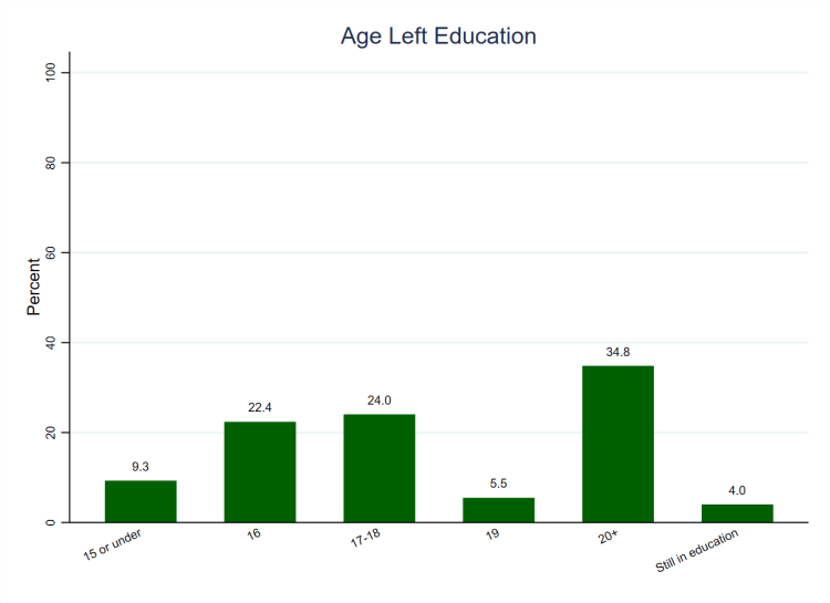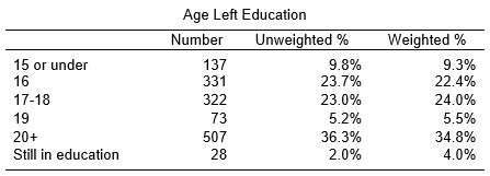 In addition to asking about their highest education level, the Privilege and Participation survey asked people what age they left education. Referring back to their education levels, a fifth of people have an undergraduate degree, a further one in fifteen have a postgraduate degree, and one in ten have technical and professional qualifications. These groups constitute almost two fifths of people (39.2%) so it is not surprising that Figure 1 (above, using weighted data) shows that more than a third of people left education when they were twenty or older. The quarter of people (24.0%) who left school when they were seventeen or eighteen is likely to encompass the one in seven who have A Levels as well as those with qualifications such as advanced City & Guilds and ONCs. Similarly, the more than a fifth of people (22.4%) who left education at sixteen are likely to include the one in eight who have GCSEs as well as those with qualifications such as some City & Guilds awards. The remaining fifth of people (18.8%) are split between those who left education at fifteen or younger (9.3%), at nineteen (5.5%), or are still in education (4.0%). Overall, the largest groups, making up four fifths of people (81.2%), are those who completed education to one of the conventional ages: sixteen (GCSEs or equivalent), eighteen (A Levels or equivalent), or around twenty-one (undergraduate or postgraduate degree).