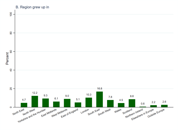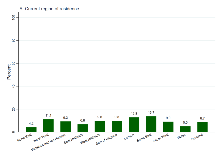 The people who answered the survey were also asked about where they grew up (panel B) and we can see that the largest group, one in six people (16.8%), did so in the South East of England. One in eight people (12.2%) grew up in the North West and between one in ten and one in twelve grew up in London (10.3%), Yorkshire and the Humber (9.3%), the West Midlands (9.0%), and Scotland (8.6%). Fewer than one in twelve people grew up in the South West (7.8%), fewer than one in sixteen did so in the East Midlands (6.1%), and one in twenty or fewer grew up in the East of England (5.1%), the North East (4.7%), Wales (4.5%), and Northern Ireland (0.6%). The region with the largest gap between current and childhood residence is the East of England, where one in ten people are resident but only one in twenty grew up. By contrast, whilst one in seven people currently reside in the South East of England, more than one in six people grew up there.[1]