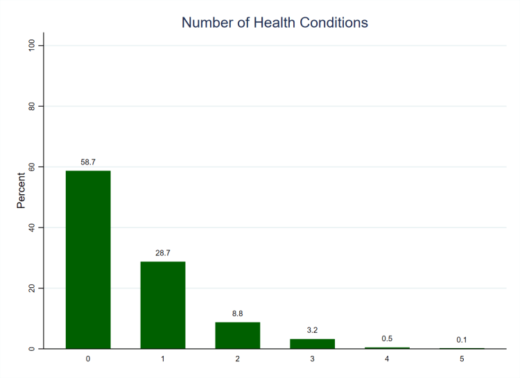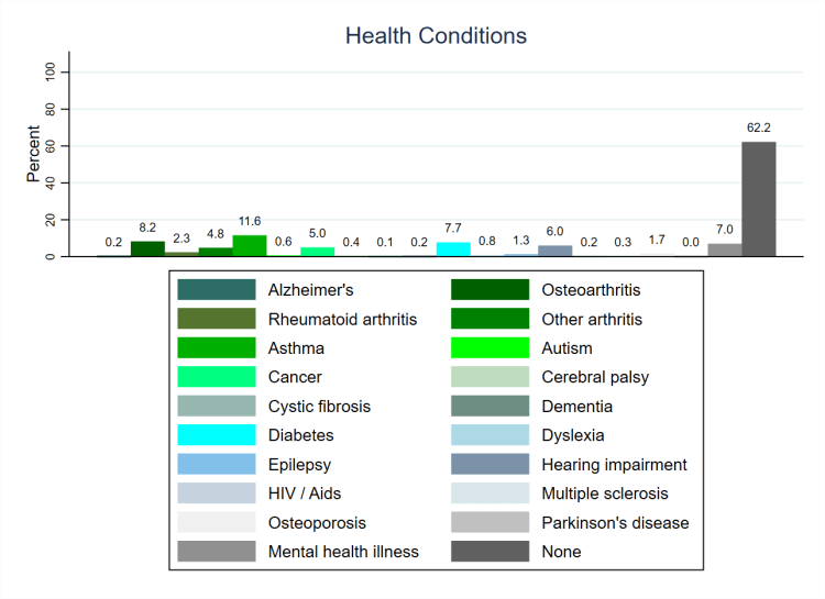 One of the most personal questions that the Privilege and Participation survey asked was about people’s health conditions. Respondents were shown a list of nineteen different physical and mental health conditions and asked to select those that they have. As we can see from Figure 1 (above, using weighted data), none of the health conditions are common and approaching three fifths of people (58.7%) indicate having none of them. Asthma is the only condition that more than one in ten people (11.6%) have, though one in twelve (8.2%) have osteoarthritis. Between one in thirteen and one in twenty people have diabetes (7.7%), a mental health condition (7.0%), hearing impairment (6.0%), cancer (5.0%), or a form of arthritis that is not specifically listed (4.8%). The remaining thirteen conditions all have very small percentages of people who indicate having them. However, if we count how many conditions people have then we see that approaching three in ten people (28.7%) have one health condition, as shown in Figure 2 (below, also using weighted data). A further one in eleven people (8.8%) have two health conditions, whilst smaller percentages have three, four, or five conditions. Overall, then, more than two fifths of people (41.3%) have at least one of the health conditions that they were asked about. Not all of them feel that their daily lives are limited because of them but people with health conditions constitute a sizeable minority within the population.