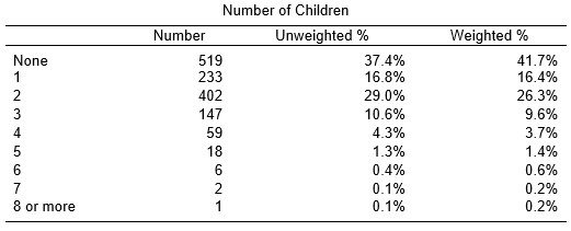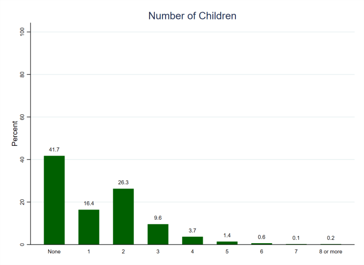 In addition to asking about the number of children in their households, the survey also asked respondents how many children they have, whether at home or not. This question includes grown up children who have left home and, hence, has a notably different distribution, as we can see in Figure 1 (above, using weighted data). Whereas almost three quarters of people (73.4%) have no children at home, only two fifths (41.7%) have no children at all. Similarly, more than half of people (52.3%) have one (16.4%), two (26.3%), or three (9.6%) children, whereas only a quarter (24.1%) have between one and three children living at home. Finally, whilst one in seventeen people (6.0%) have four or more children, fewer than one in one hundred and sixty people (0.6%) have that many children living at home. Thus, unsurprisingly, there are lots of people who have children that have grown up and flown the nest, and notably fewer people who have children still living at home with them.