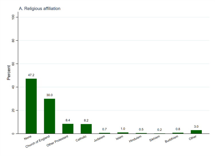 As Verba, Schlozman, and Brady showed thirty years ago, albeit in the context of the United States, religious institutions can act as important drivers of political participation. They provide social networks and prompt people to develop and use civic skills, both of which can prove useful when participating in politics. As such, the Privilege and Participation survey asked people about their religious identities and activities. As we can see in Figure 1 (above, using weighted data), almost half of people (47.2%) do not feel an affinity with any religion (panel A).[1] Three in ten (30.0%) identify as Church of England, a further one in twelve (8.4%) see themselves as some other type of Protestant and a similar number (8.2%) see themselves as Catholic, leaving 6.8% of people who identify as another religion. Crucially, however, fewer people exercise their religious beliefs by undertaking the basic religious activity of attending services (Panel B). More than two thirds of people (68.8%) never attend services, whilst almost a fifth (18.8%) do so less than monthly. This leaves only one in eight people (12.4%) who attend religious services at least once a month.