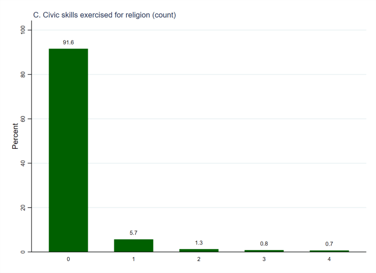 The low levels of religious activity are further illustrated by the amounts of time, money, and civic skills that are contributed or dedicated to people’s religions, as shown in Figure 3 (below, also using weighted data).[2] Only one in twenty-five people (4.0%) volunteer at least two hours a week for their religion, and we can imagine that it is the dedication this very small group of people who keep some religious congregations and institutions running. As we saw above, People are more generous with their money and, whilst one in eight (12.8%) give £50 or less per year, one in ten (10.8%) donate at least £50 to their religion each year. At the higher end of the scale, a small group of one in twenty-five people (3.9%) donate at least £500 a year, representing a sizeable contribution to the coffers of religious institutions and congregations. Finally, manifesting the opposite trend to volunteering and donating, the small minority of people who exercise civic skills on behalf of their religions are most likely to do so in only one fashion (one in eighteen people (5.7%)). Fewer than one in seventy-five people (1.3%) exercise two skills, and fewer than one in a hundred stretch to either three (0.8%) or four (0.7%). Thus, as we saw with donating and volunteering for organisations more generally, there are small numbers of people who are willing to make considerable contributions to keep religious organisations going whilst most people rarely or never engage, even if they identify as having a religion.