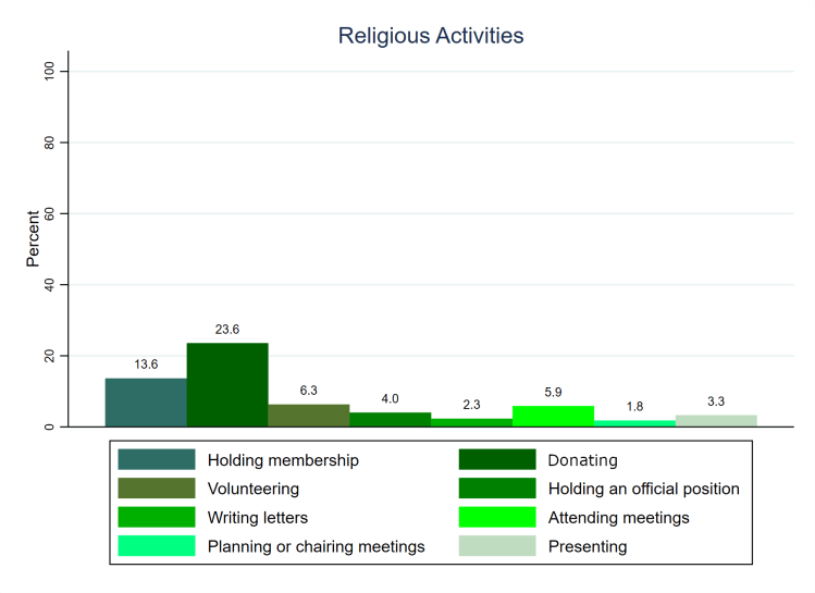 This low level of religious participation is also manifested in the small numbers who undertake various voluntary activities for their religion, as shown in Figure 2 (below, also using weighted data). The exception to this is the almost one quarter of people (23.6%) who donate money to their religion, which might be through collections at services, donating to appeals for charitable causes made by religious institutions, or support for religious charities. Beyond donating, however, only one in seven people (13.6%) consider themselves to be a member of a local religious congregation, half as many (6.3%) volunteer for their congregation, and a similar number (5.9%) attend meetings (other than services) relating to their religion. No more than one in twenty-five people participate in any of the other activities relating to their religion: holding a voluntary official position (4.0%); giving presentations (3.3%); writing letters (2.3%); planning or chairing meetings (1.8%). Thus, it is fair to say that Great Britain is not teaming with people who undertake extensive religious activities.