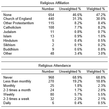 As Verba, Schlozman, and Brady showed thirty years ago, albeit in the context of the United States, religious institutions can act as important drivers of political participation. They provide social networks and prompt people to develop and use civic skills, both of which can prove useful when participating in politics. As such, the Privilege and Participation survey asked people about their religious identities and activities. As we can see in Figure 1 (above, using weighted data), almost half of people (47.2%) do not feel an affinity with any religion (panel A).[1] Three in ten (30.0%) identify as Church of England, a further one in twelve (8.4%) see themselves as some other type of Protestant and a similar number (8.2%) see themselves as Catholic, leaving 6.8% of people who identify as another religion. Crucially, however, fewer people exercise their religious beliefs by undertaking the basic religious activity of attending services (Panel B). More than two thirds of people (68.8%) never attend services, whilst almost a fifth (18.8%) do so less than monthly. This leaves only one in eight people (12.4%) who attend religious services at least once a month.