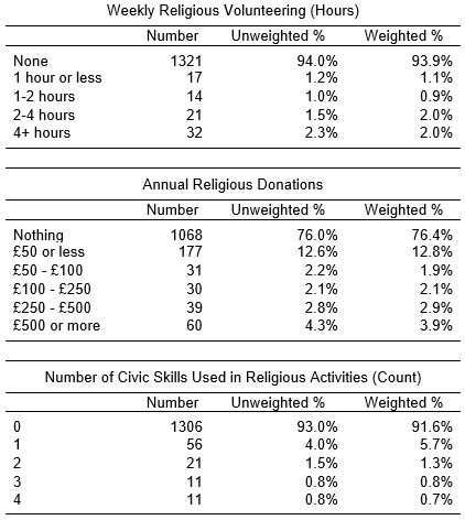 The low levels of religious activity are further illustrated by the amounts of time, money, and civic skills that are contributed or dedicated to people’s religions, as shown in Figure 3 (below, also using weighted data).[2] Only one in twenty-five people (4.0%) volunteer at least two hours a week for their religion, and we can imagine that it is the dedication this very small group of people who keep some religious congregations and institutions running. As we saw above, People are more generous with their money and, whilst one in eight (12.8%) give £50 or less per year, one in ten (10.8%) donate at least £50 to their religion each year. At the higher end of the scale, a small group of one in twenty-five people (3.9%) donate at least £500 a year, representing a sizeable contribution to the coffers of religious institutions and congregations. Finally, manifesting the opposite trend to volunteering and donating, the small minority of people who exercise civic skills on behalf of their religions are most likely to do so in only one fashion (one in eighteen people (5.7%)). Fewer than one in seventy-five people (1.3%) exercise two skills, and fewer than one in a hundred stretch to either three (0.8%) or four (0.7%). Thus, as we saw with donating and volunteering for organisations more generally, there are small numbers of people who are willing to make considerable contributions to keep religious organisations going whilst most people rarely or never engage, even if they identify as having a religion.
